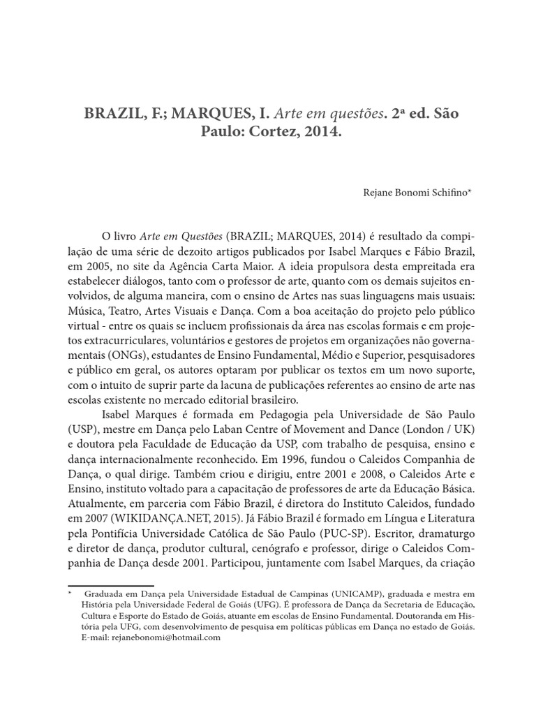 O livro Arte em Questões (BRAZIL; MARQUES, 2014) é resultado da compi- lação de uma série de dezoito artigos publicados por Isabel Marques e Fábio Brazil, em 2005, no site da Agência Carta Maior. A ideia propulsora desta empreitada era estabelecer diálogos, tanto com o professor de arte, quanto com os demais sujeitos en- volvidos, de alguma maneira, com o ensino de Artes nas suas linguagens mais usuais:
