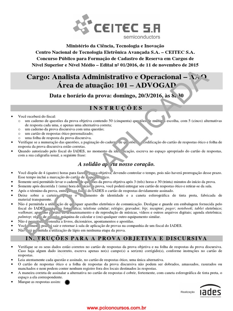 Data e horário da prova: domingo, 20/3/2016, às 8h30