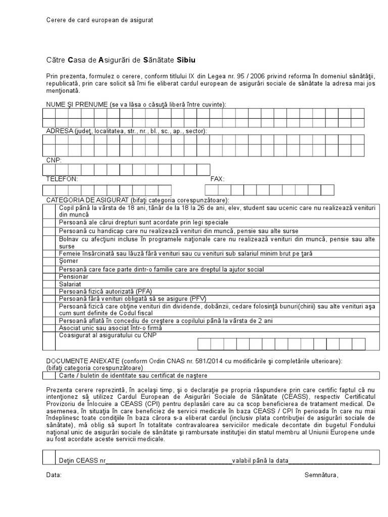 republicată, prin care solicit să îmi fie eliberat cardul european de asigurări sociale de sănătate la adresa mai jos