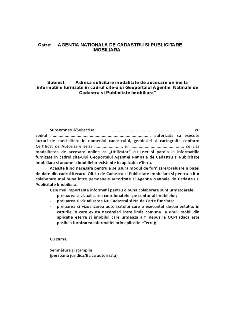 Catre: AGENTIA NATIONALA DE CADASTRU SI PUBLICITARE