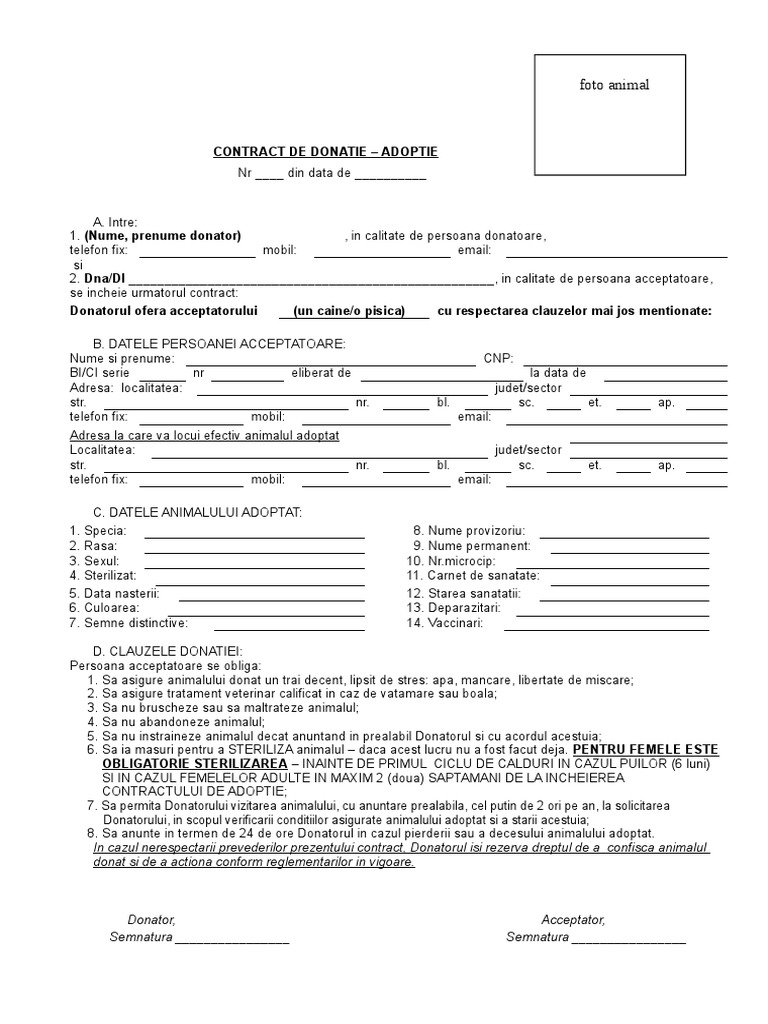 Donatorul ofera acceptatorului (un caine/o pisica) cu respectarea clauzelor mai jos mentionate: