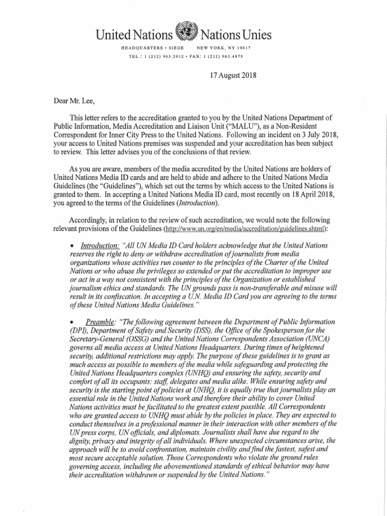 The letter informed me, without a single opportunity to be heard and offer rebuttal, that “your accreditation is hereby withdrawn pursuant to the Guidelines.” Inner City Press had informed Smale, and Secretary General Antonio Guterres who is ultimately responsible for this, that Smale must recuse herself.