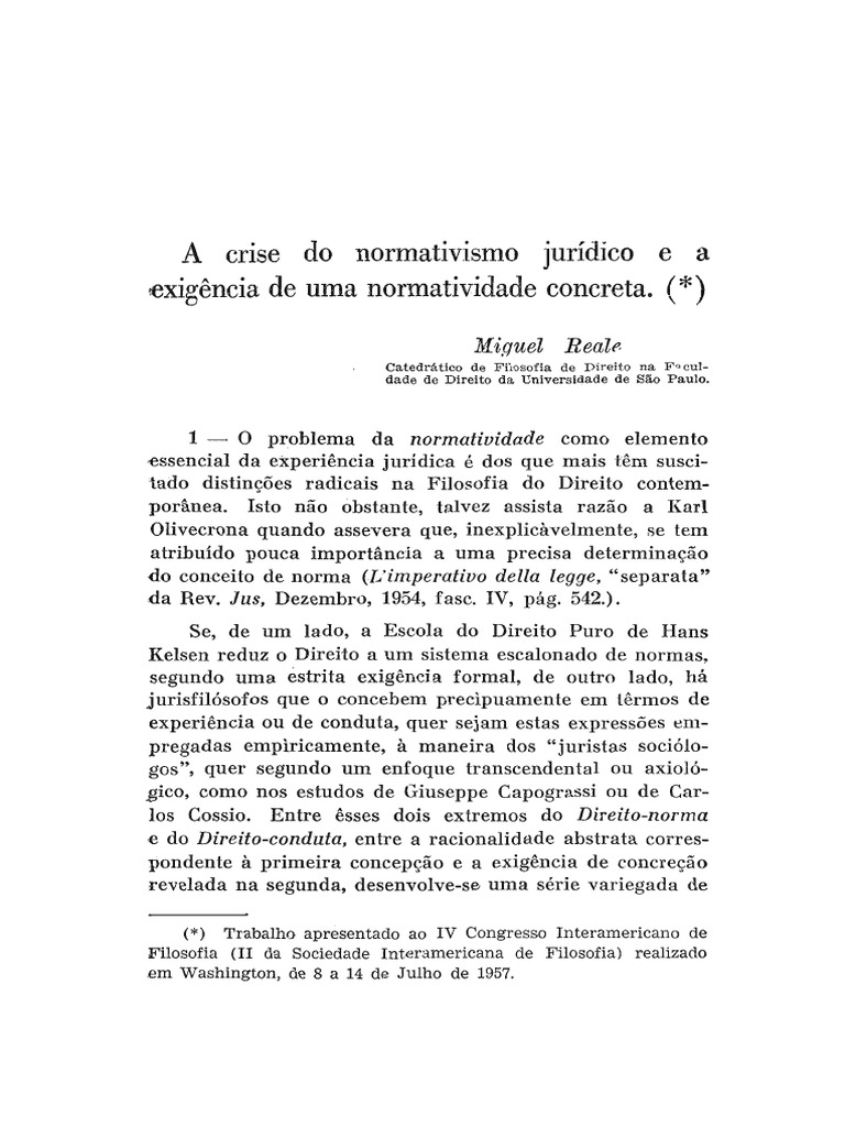 1 — O problema da normatividade como elemento essencial da experiência jurídica é dos que mais têm susci- tado distinções radicais na Filosofia do Direito contem- porânea. Isto não obstante, talvez assista razão a Karl Olivecrona quando assevera que, inexplicavelmente, se tem atribuído pouca importância a um a precisa determinação d o conceito de norm a (L'imperativo delia legge, "separata" da Rev. Jus, Dezembro, 1954, fase. IV, pág. 542.).