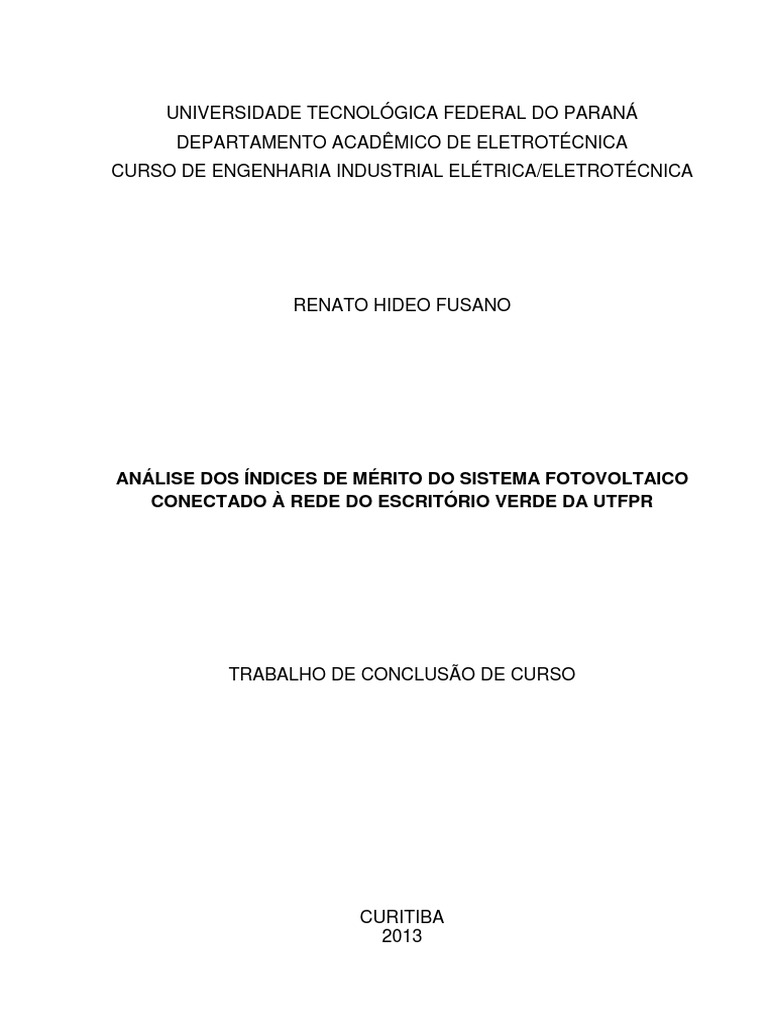 FUSANO, Renato Hideo. Análise dos Índices de Mérito do Sistema Fotovoltaico Conectado à Rede do Escritório Verde da UTFPR. 2013. 94 f. Trabalho de Conclusão de Curso (Engenharia Industrial Elétrica – Ênfase Eletrotécnica), Universidade Tecnológica Federal do Paraná. Curitiba, 2013.