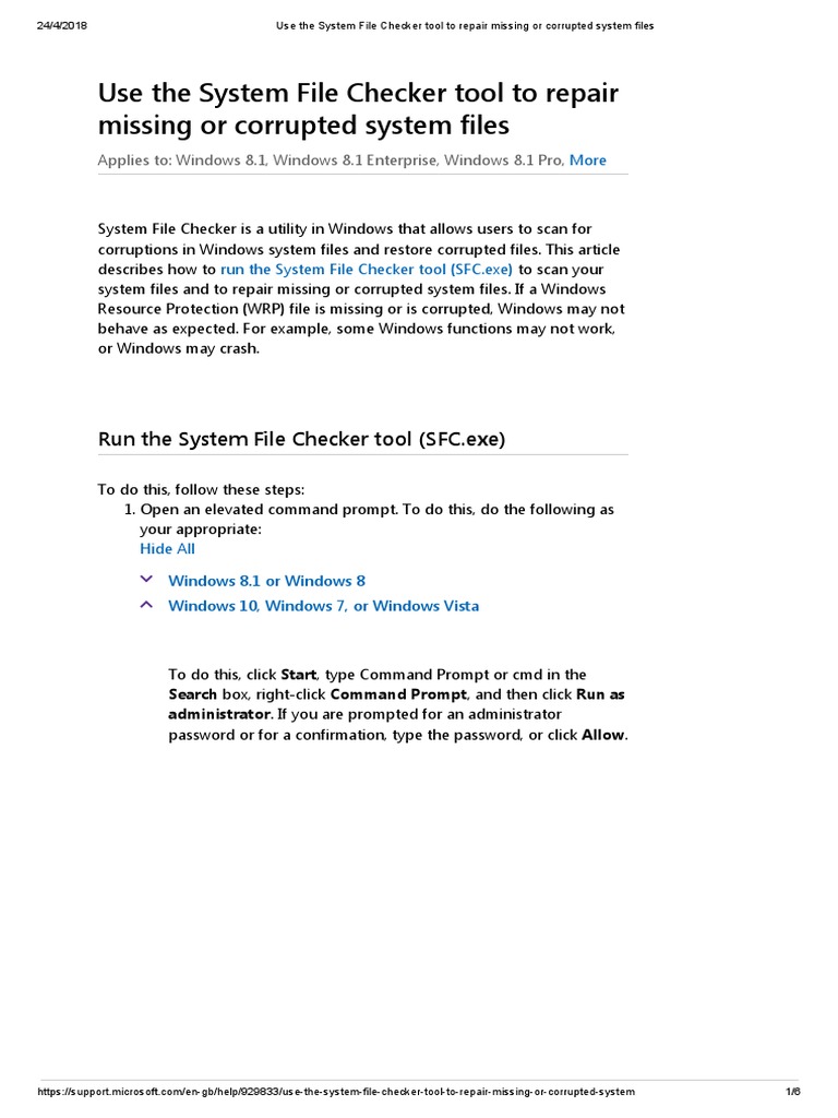 https://support.microsoft.com/en-gb/help/929833/use-the-system-file-checker-tool-to-repair-missing-or-corrupted-system 1/6