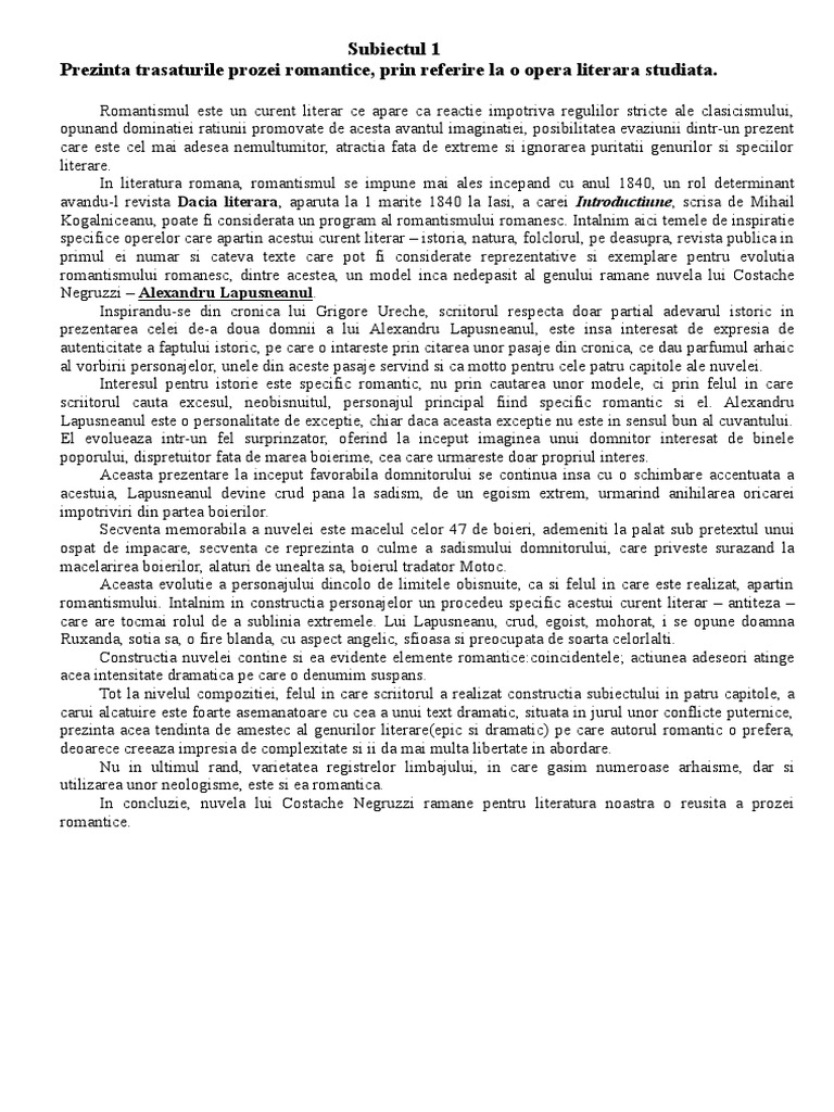 romantismului romanesc, dintre acestea, un model inca nedepasit al genului ramane nuvela lui Costache