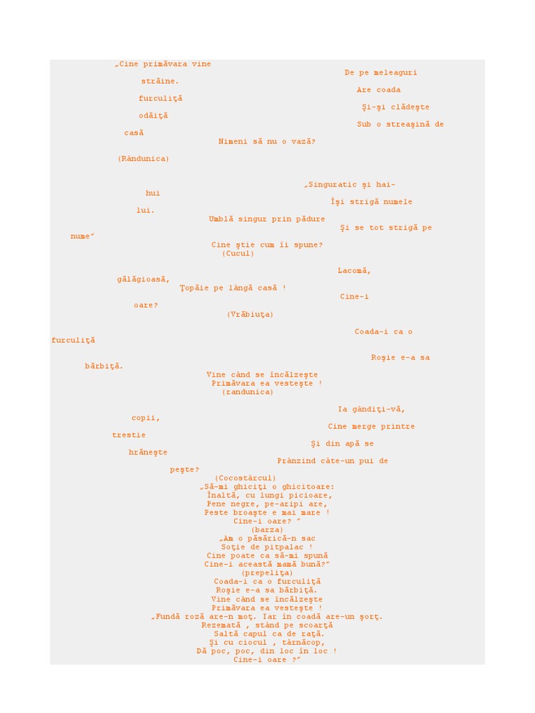 „Fundă roză are-n moţ. Iar în coadă are-un şorţ.