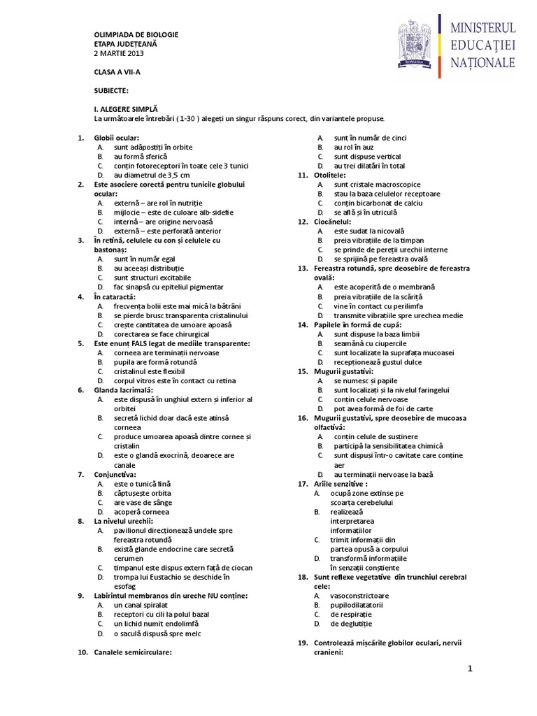 La următoarele întrebări ( 1-30 ) alegeţi un singur răspuns corect, din variantele propuse.