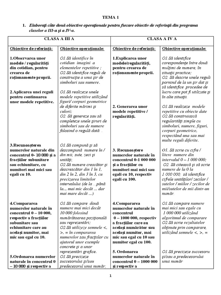 1. Elaboraţi câte două obiective operaţionale pentru fiecare obiectiv de referinţă din programa