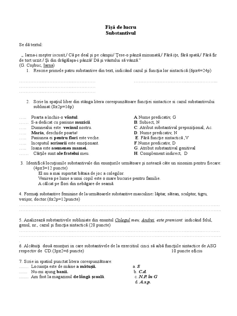 genul, nr., cazul şi funcţia sintactică.(20 puncte)