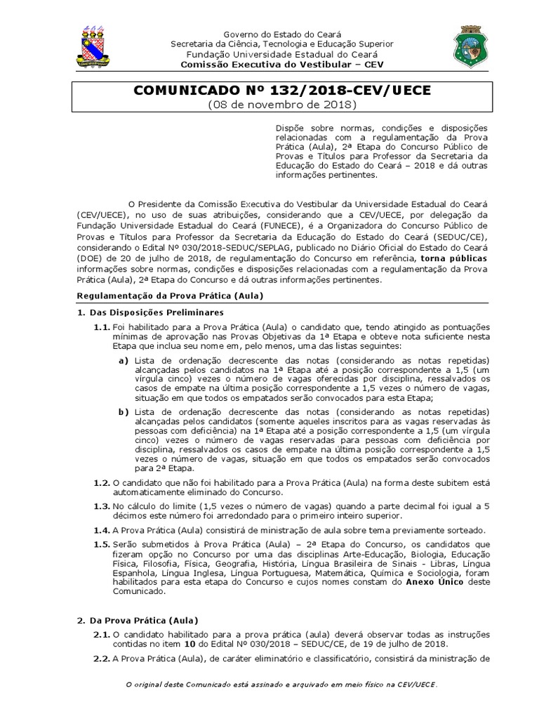 O original deste Comunicado está assinado e arquivado em meio físico na CEV/UECE.