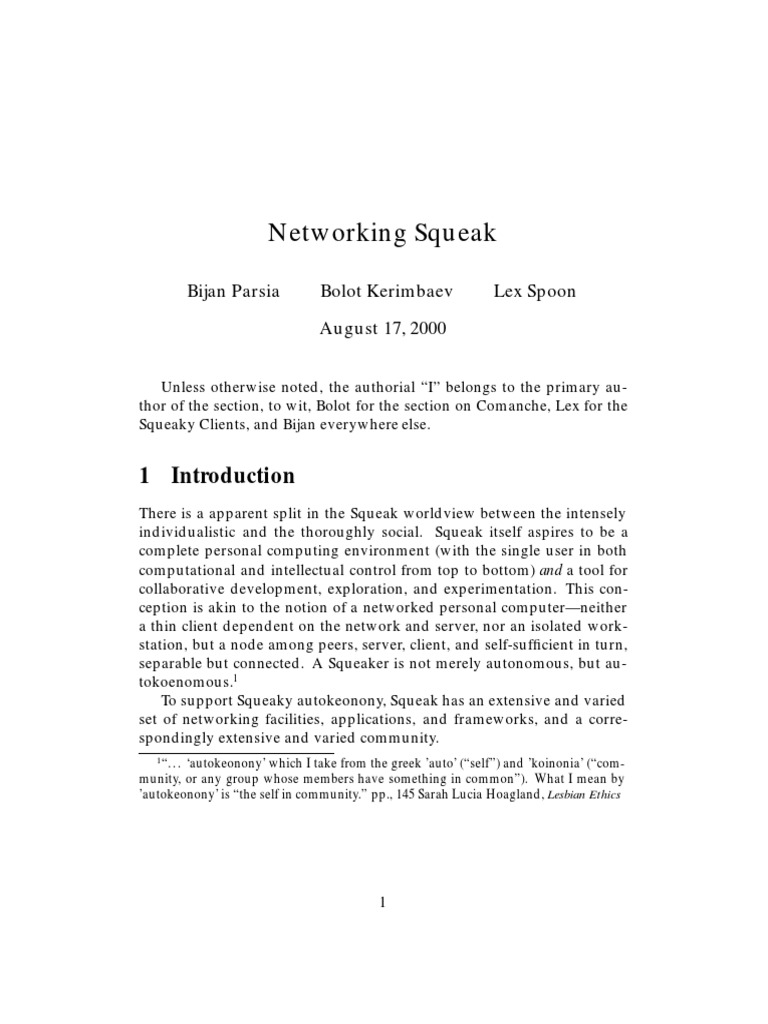 There is a apparent split in the Squeak worldview between the intensely individualistic and the thoroughly social. Squeak itself aspires to be a complete personal computing environment (with the single user in both computational and intellectual control from top to bottom) and a tool for collaborative development, exploration, and experimentation. This con- ception is akin to the notion of a networked personal computer—neither a thin client dependent on the network and server, nor an isolated work- station, but a node among peers, server, client, and self-sufficient in turn, separable but connected. A Squeaker is not merely autonomous, but au- tokoenomous. 1 To support Squeaky autokeonony, Squeak has an extensive and varied set of networking facilities, applications, and frameworks, and a corre- spondingly extensive and varied community.