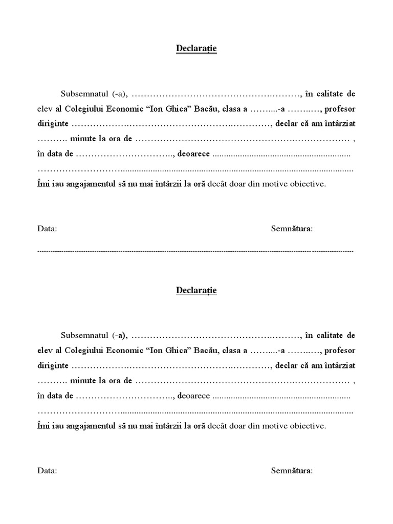 Îmi iau angajamentul să nu mai întârzii la oră decât doar din motive obiective.