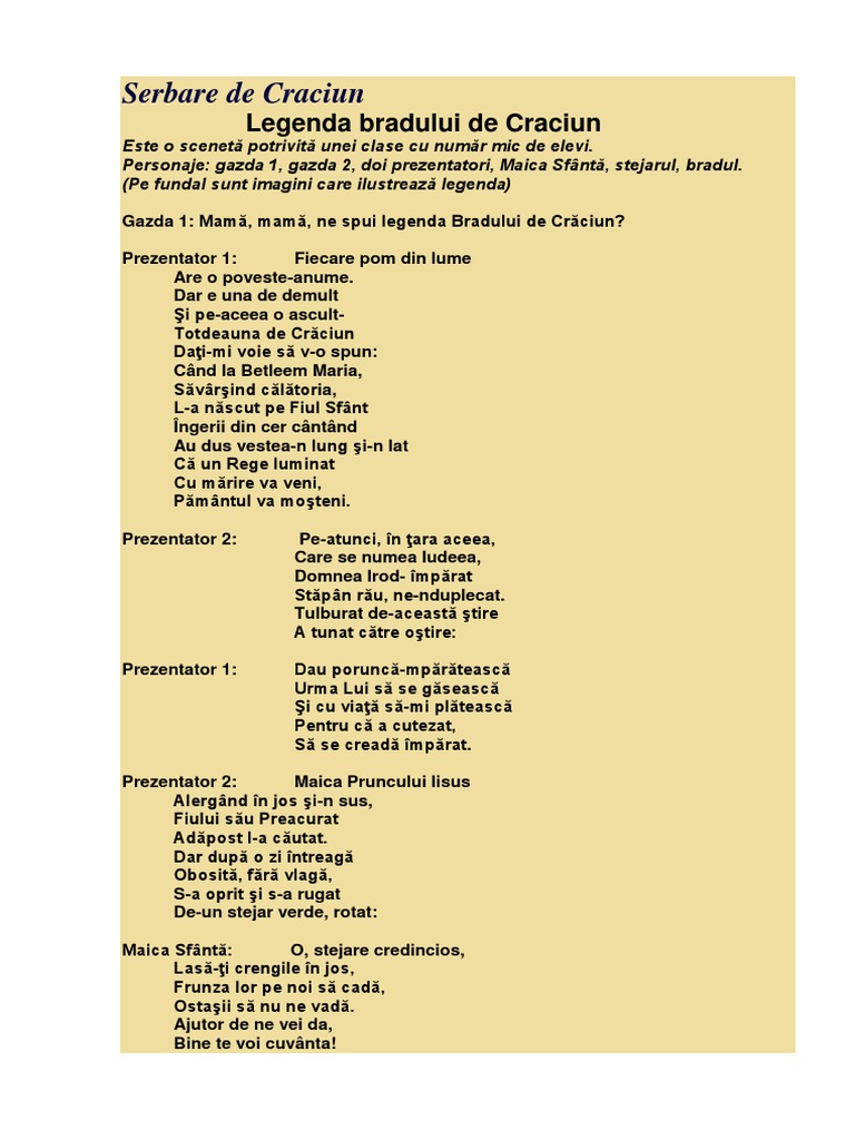 Personaje: gazda 1, gazda 2, doi prezentatori, Maica Sfântă, stejarul, bradul.