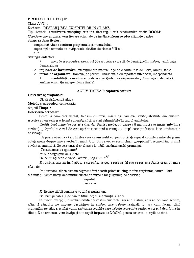 deci formula: vec-cv şi apoi câte un elev va scrie la tablă cuvântul despărţit în silabe. Ceilalţi vor face