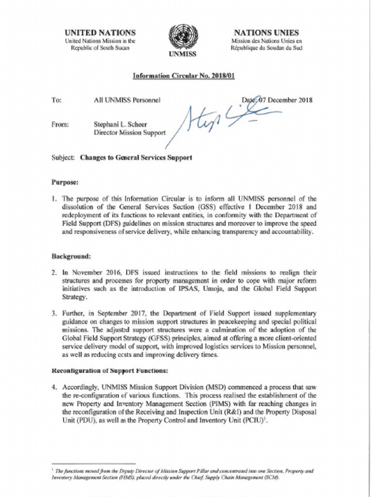 UNITED NATIONS GATE, December 8 – When youth leaders from South Sudan and DR Congo took questions on 26 October 2018, it was across the street from the UN and Inner City Press went to ask and live-stream. Video here. It asked about the performance of the UN Mission UNMISS. Inner City Press asked the spokesmen for UN Secretary General Antonio Guterres in writing, "South Sudan's Susan Kyunon Sebit William told Inner City Press that UNMISS does not sufficiently protect civilians, particularly women, citing Terrain Hotel etc. What IS the UN doing? What did it learn?" Apparently nothing - these was no answer, more than a month later. How badly run is this UNMISS mission? Today, as Guterres after Inner City Press questions to him about UN corruption he encourages has banned Inner City Press from a "UN Human Rights" event on December 10, we have another story from a UN whistleblower in South Sudan. It involves a UN official Inner City Press has long been told and reported about (from 2007 in Liberia to 2016 with Ladsous), Stephani Scheer (said to be 'Cindy', in the book about the Oil for Food scandal "Backstabbing for Beginners"). Because Guterres' decayed UN has reached the point where it physically ousts those who ask Guterres about (his) corruption and then refuses to response to written questions on such matters, here it is, as sent to Inner City Press, Guterres' USG Jan Beagle and other email address on which we will have more: "Hello Mathew, I sent this to you and UN official in the same address. Staff are crying here because the lady dismantled the section after being exposed to get unnecessary benefits with retired former boyfriend of UN Staff member (Christopher Fathers). She is only remaining two weeks to retire but revenged the staff. You know She is an American but going to live in South Africa hiding USA taxation of her huge amount she got from the missions including Oil for food program in Iraq. [See above, and Backstabbing for Beginners. More from UNMISS staff:] The mother of corruption in UNMISS is on the farewell this month. She has been considered the most influential and monster woman messing up the whole system. She had a plan to get million dollars in the name of restructuring with her former boy friend Christopher but failed after being exposed. Now she has decided to abolish the GSS office at the last minute and fired those innocent staff members at her retirement (see the attachment). The current SRSG does not have the knowledge on the administrative reconfiguration of different functions. The mother of corruption has considered him as a small boy and did not share him any plan on reforming the staff structure. He only spent playing music and guitars with his fans while staff are severely affected and being suffered due to maladministration . Majority staff have lost respect for the current SRSG [David Shearer] and his team. He is not proactive in identifying and preventing potential staff problems. The Secretary General of whistle-blower policy has officially been annulled in UNMISS. No guarantee for whistle-blowers in the UNITED NATIONS! Thank you Inner City for becoming our voice!" No problem. Here's from the 7 December 2018 memo from Scheer, as Director of Mission Support of UNMISS: "With the dissolution of GSS [some] staff could not be accommodated under the new functions as their qualifications and experience do not satisfy the requirement" -- unless they are cronies of Guterres, or Shearer, or Scheer. We'll have more on this.