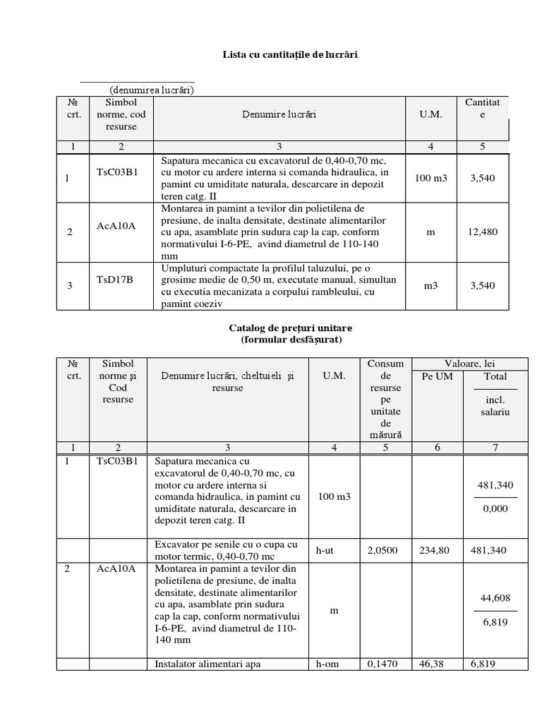 crt. norme şi Denumire lucrări, cheltuieli şi U.M. de Pe UM Total