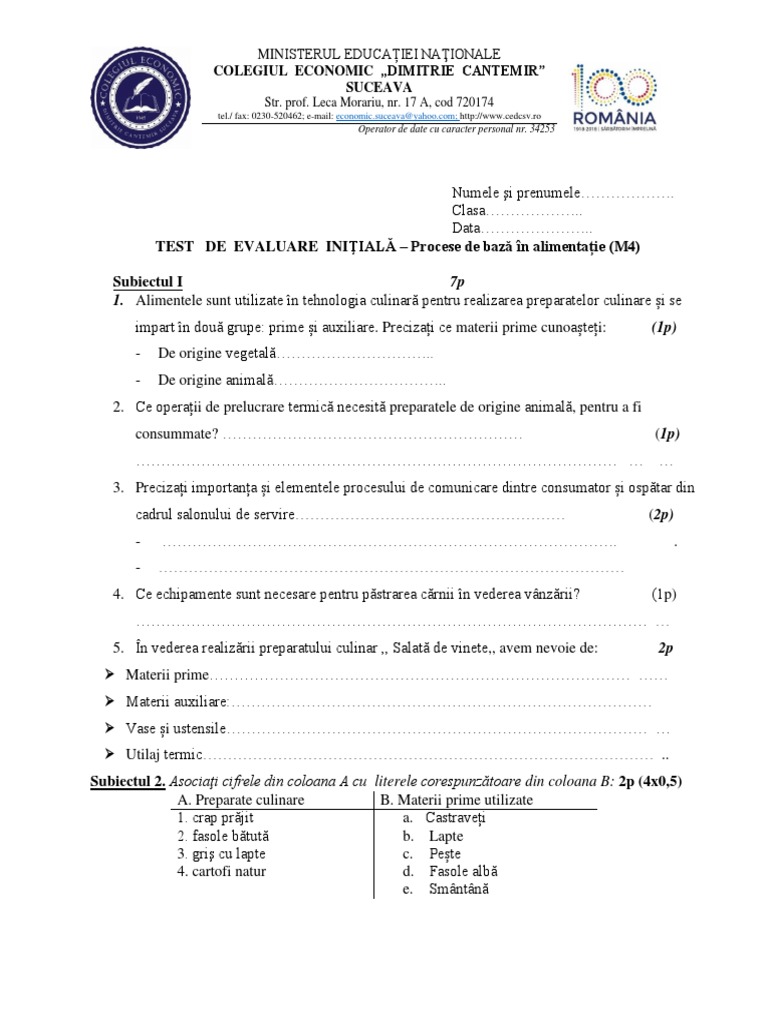 TEST DE EVALUARE INIŢIALĂ – Procese de bază în alimentație (M4)