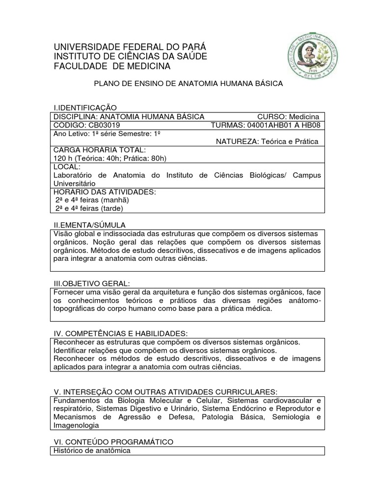 PLANO DE ENSINO DE ANATOMIA HUMANA BÁSICA