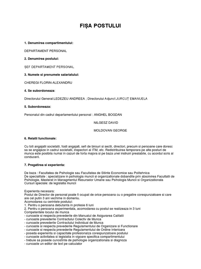 Postul de Director de personal poate fi ocupat de orice persoana cu o pregatire corespunzatoare si care