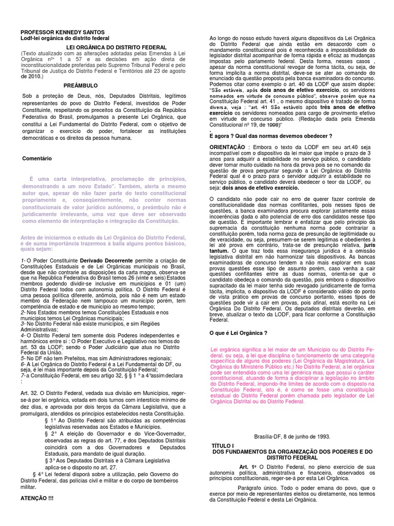 Lodf-lei orgânica do distrito federal Ao longo do nosso estudo haverá alguns dispositivos da Lei Orgânica