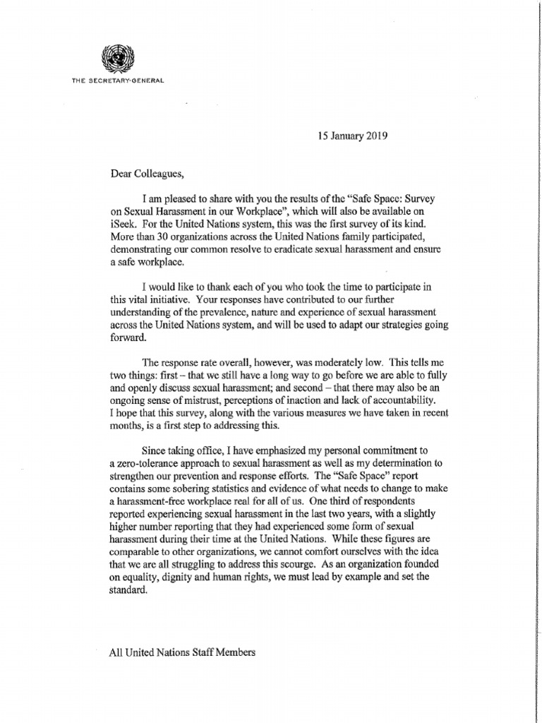 UNITED NATIONS GATE, January 16 -- UN Secretary General Antonio Guterres has claimed he has a "zero tolerance" policy for sexual harassment, and for retaliation. But after Guterres imposed on Inner City Press on ongoing ban against entering the UN, made permanent by his Alison Smale in an August 17 unappealable letter, his two spokesman are refusing to answer written questions from Inner City Press about Guterres ignoring victims of abuse and harassment including at UNAIDS under Michel Sidibe. Now in Guterres' increasingly corrupt UN system, a briefing has been proffered for January 16 - but tellingly not on the UN's Media Alert - on a report on sexual harassment the UN paid Deloitte for. Inner City Press has been provided with it by multiple sources and exclusively puts it online here, for crowd-sourcing. And here now is Guterres' cover letter to staff. Before the day's noon briefing Inner City Press in writing asked Guterres, Deputy Amina J. Mohammed, Alison Smale and spokesman Stephane Dujarric: "January 16-4: The Deloitte "Safe Space Survey Report," how much did it cost the public? How was Deloitte chosen? What is the SG's comment and action on the systemic sexual harassment at UNAIDS, UNFPA including Diego Palacios (will SG lift immunity? If not, why not?), ICSC and UNESCO? Who has been held accountable? January 16-5: Relatedly, what is the SG's response to UN staff complaints that the report only covered sexual harassment and excluded abuse of authority and harassment in general, which a separate survey by staff unions showed to be seven times more prevalent in the organisation. So some staff in the field will get fired for visiting prostitutes but major harassers at the senior level remain protected. And what about Jan Beagle who was part of senior management at UNAIDS and linked in the independent report to facilitating a culture of harassment when there? How does the SG respond, if at all?" Three hours later, no response at all. But this, from Code Blue: "Code Blue is unsurprised by the UN staff survey results but shocked and deeply concerned by disingenuous statements within Secretary-General Mr. Guterres’ letter announcing the results to UN personnel. What follows is an initial fact-check of some of the most unacceptable statements within the Secretary-General’s letter. “Since taking office, I have emphasized my personal commitment to a zero-tolerance approach to sexual harassment...” FACT: Last month, an Independent Expert Panel (IEP) released conclusions of its 6-month inquiry into “sexual harassment, abuse of power, and bullying at UNAIDS, saying that the Executive Director, Michel Sidibé, has “created a patriarchal culture tolerating harassment and abuse of authority” that “fails to uphold the United Nations’ law and values.” The panel called for his dismissal. Mr. Guterres has not suspended Mr. Sidibé, asked for his resignation, nor made any comment. “As an organization founded on equality, dignity and human rights, we must lead by example and set the standard.” FACT: The Secretary-General has never commented on any of the recent public reports of sexual misconduct in several other UN organizations —including the United Nations Population Fund (UNFPA), the World Food Programme (WFP), and the United Nations High Commissioner for Refugees (UNHCR). “Significant steps have also been taken to strengthen our system-wide investigative capacity to accelerate investigations…” FACT: Six new investigators have been hired. The survey indicates that 5,162 UN personnel were subjected to sexual harassment in the past two years. In April 2018, Mr. Guterres announced that he was initiating a new investigation, through OIOS, into sexual assault and harassment charges lodged against the former Deputy Executive Director of UNAIDS, Luiz Loures. Nothing has been announced since about this “new investigation.” “[Significant steps have also been taken]..