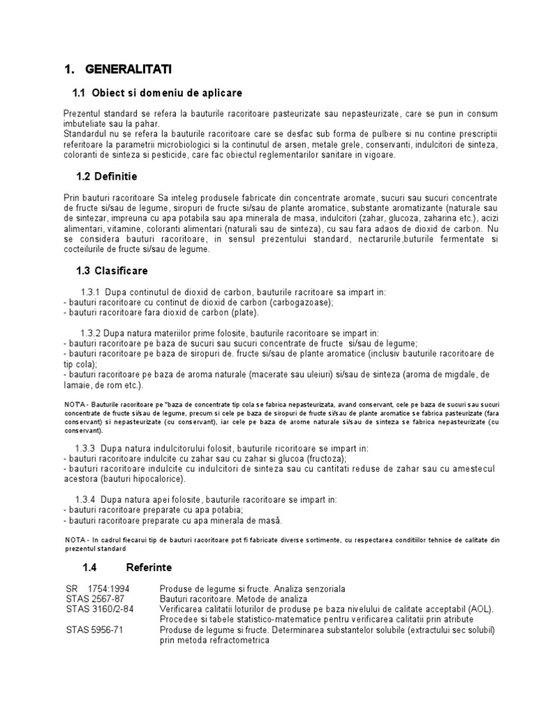 Prezentul standard se refera la bauturile racoritoare pasteurizate sau nepasteurizate, care se pun in consum