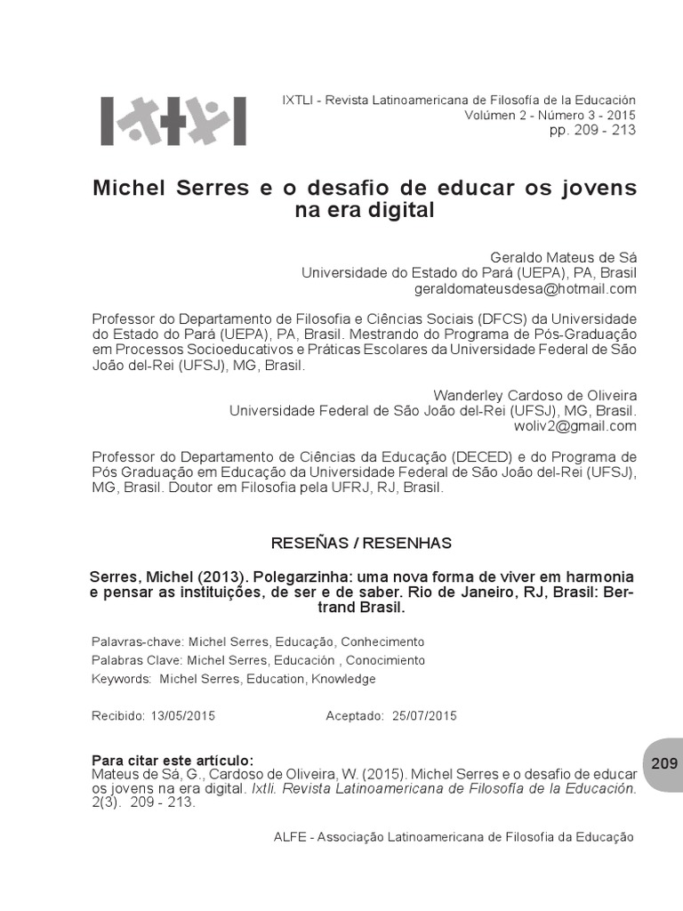 Mateus de Sá, G., Cardoso de Oliveira, W. (2015). Michel Serres e o desafio de educar os jovens na era digital. Ixtli. Revista Latinoamericana de Filosofía de la Educación. 2(3). 209 - 213.