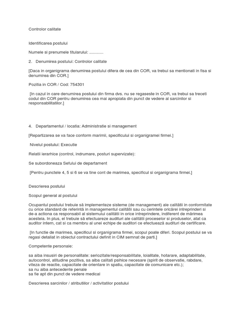 [Daca in organigrama denumirea postului difera de cea din COR, va trebui sa mentionati in fisa si