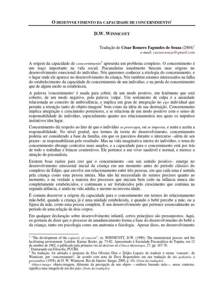 Winnicott, por ‘concernimento’; de acordo com nota de Davy Bogomoletz em sua tradução de Da pediatria à