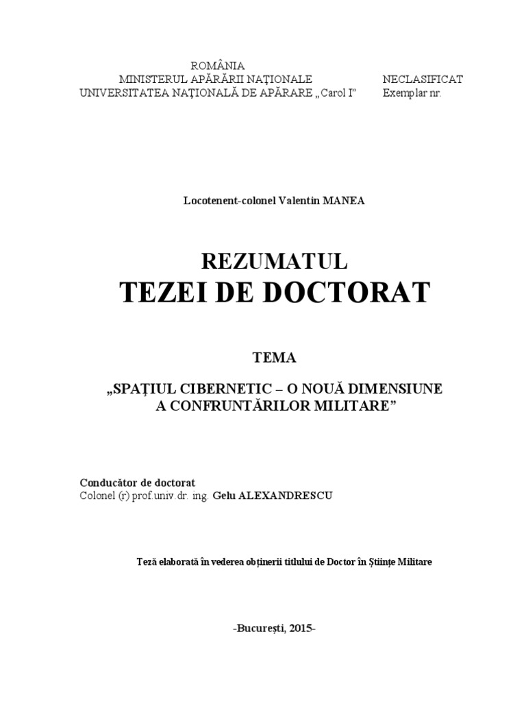 Teza de doctorat cu tema „Spaţiul cibernetic – o nouă dimensiune a