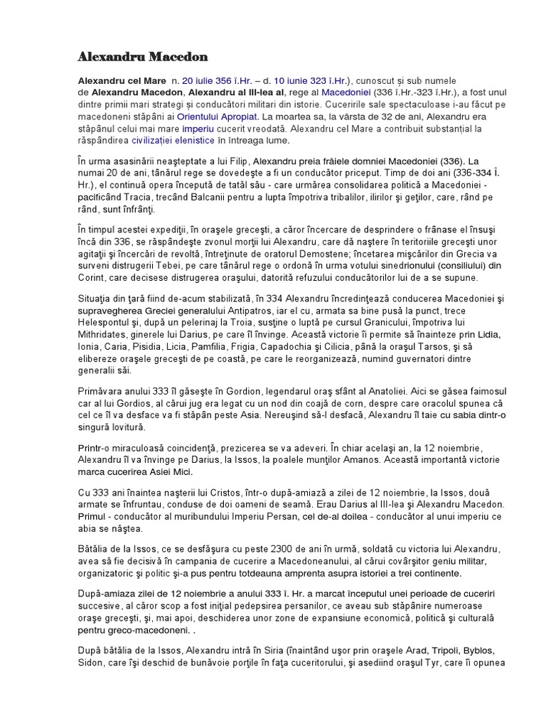 Alexandru Macedon 356 -323 î.Hr.- s-a născut la Pella, capitala Macedoniei. A fost