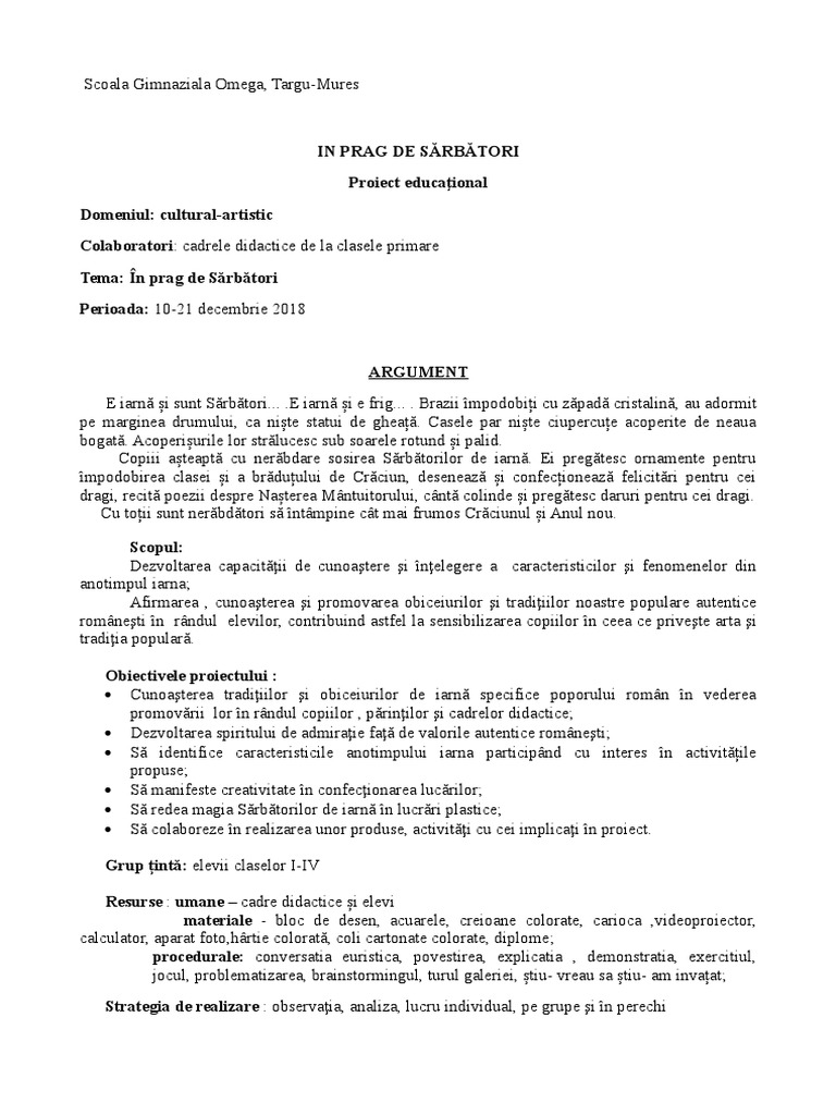 desfăşura in cele două săptămâni dedicate proiectului sub îndrumarea cadrului didactic ;