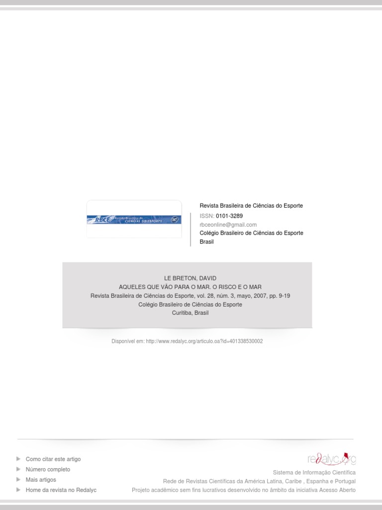 LE BRETON, DAVID AQUELES QUE VÃO PARA O MAR. O RISCO E O MAR Revista Brasileira de Ciências do Esporte, vol. 28, núm. 3, mayo, 2007, pp. 9-19 Colégio Brasileiro de Ciências do Esporte Curitiba, Brasil