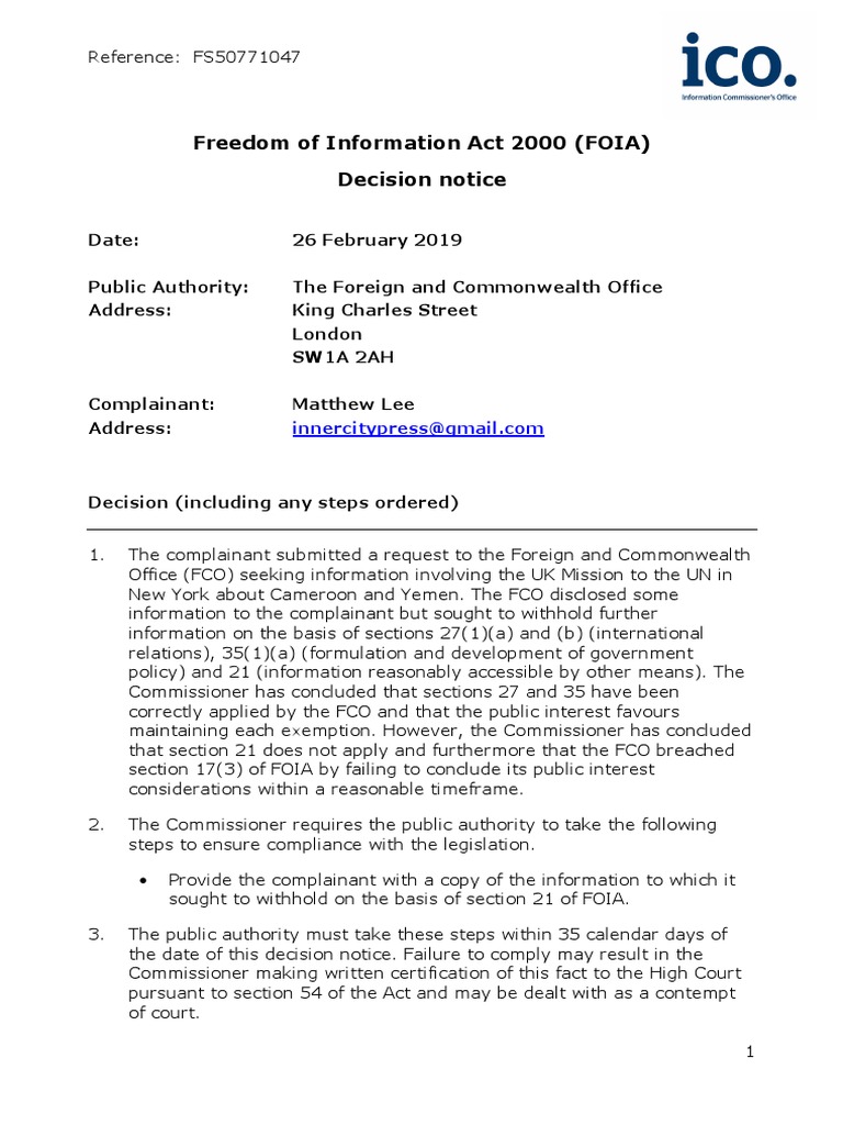 13. The complainant contacted the FCO on 24 March 2018 in order to ask