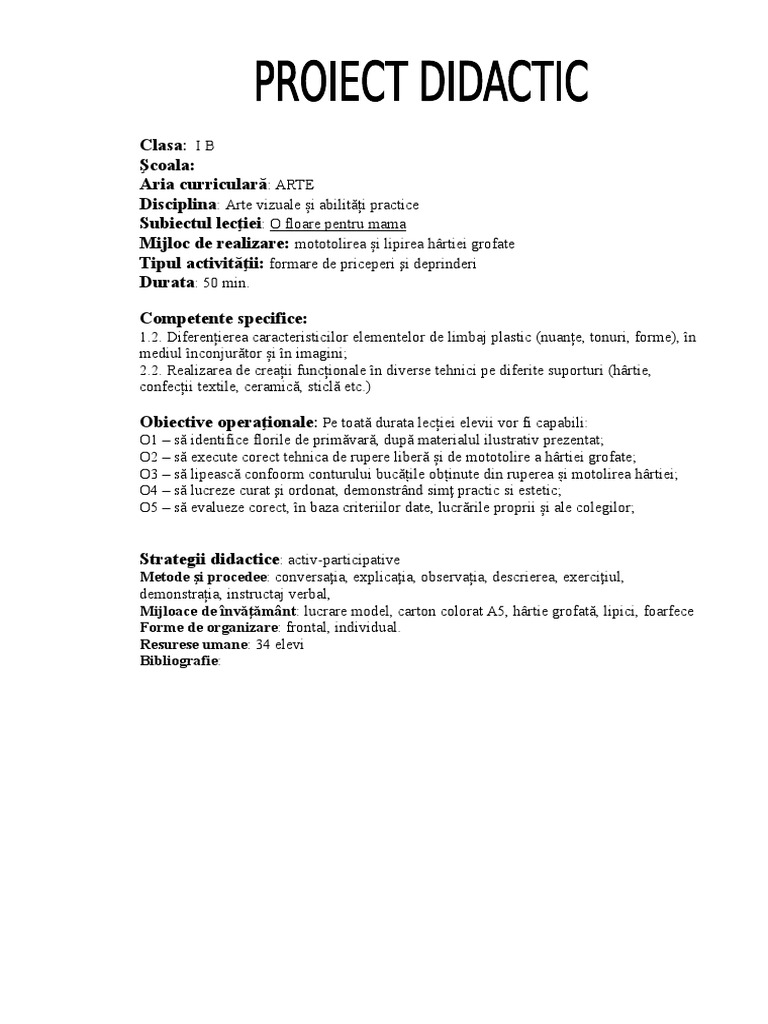 Mijloace de învăţământ: lucrare model, carton colorat A5, hârtie grofată, lipici, foarfece