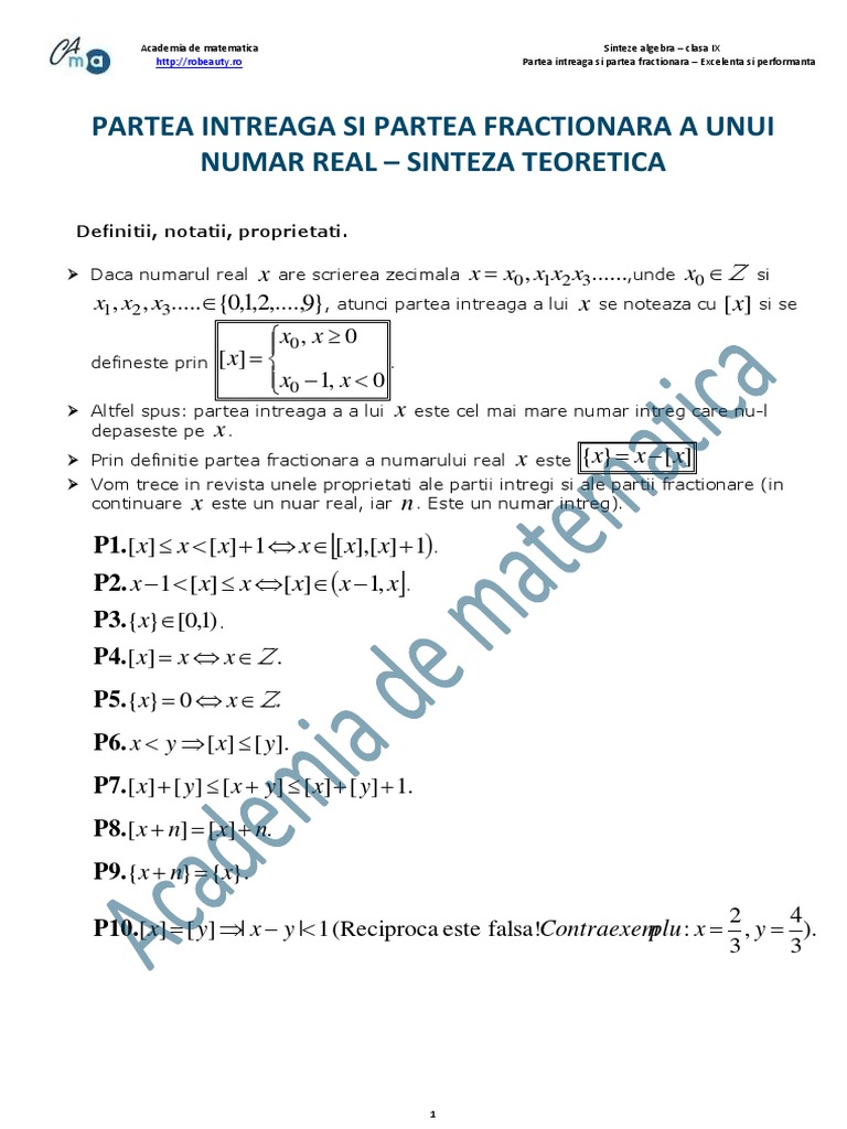 Vom trece in revista unele proprietati ale partii intregi si ale partii fractionare (in