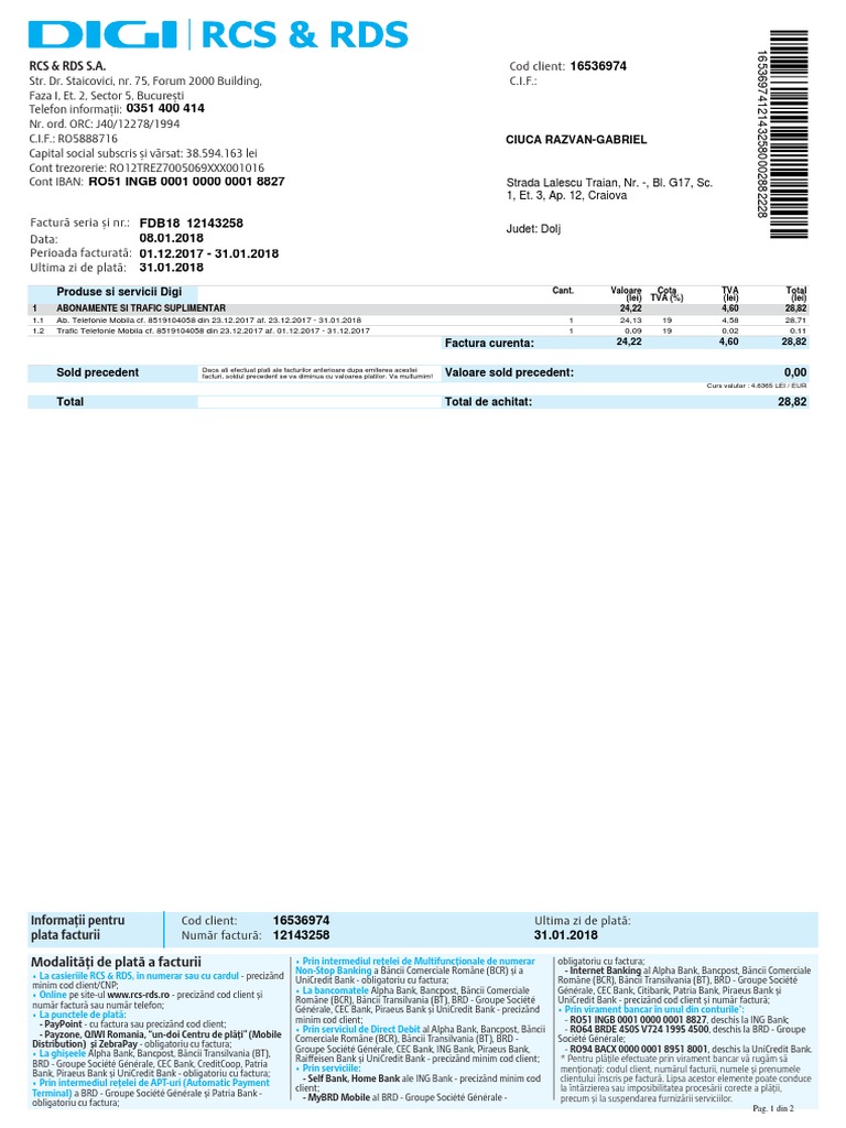 Factură seria și nr.: FDB18 12143258 Judet: Dolj