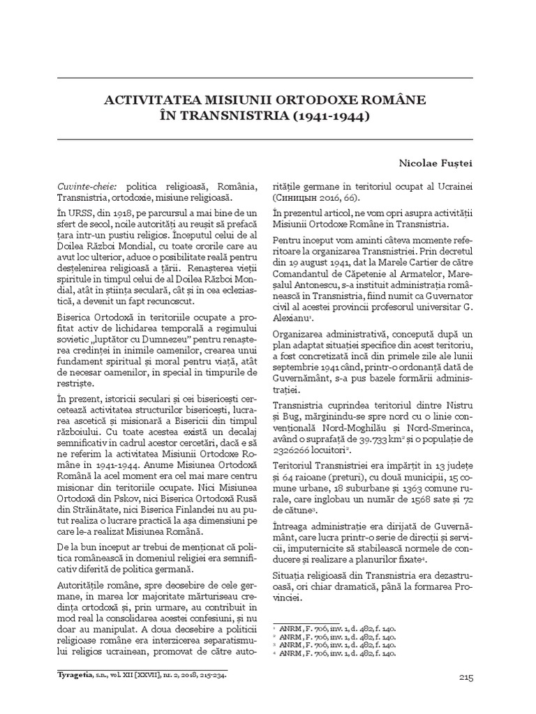 N. Fuștei, Activitatea Misiunii Ortodoxe Române în Transnistria (1941-1944)