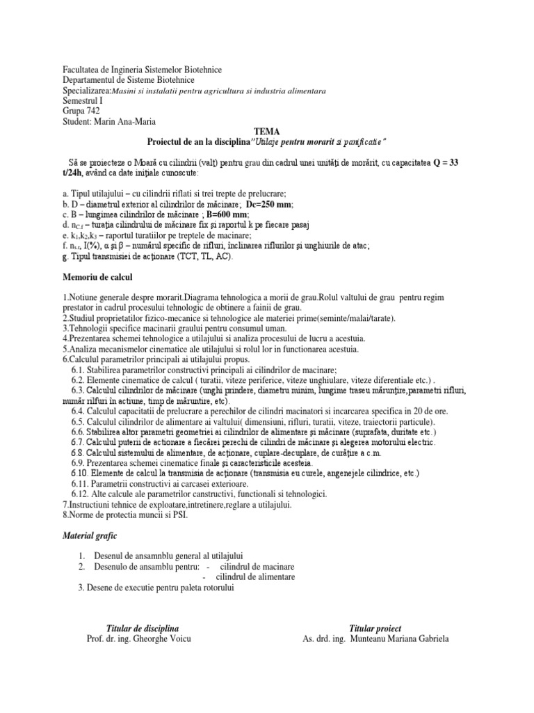 Să se proiecteze o Moară cu cilindrii (valţ) pentru grau din cadrul unei unităţi de morărit, cu capacitatea Q = 33