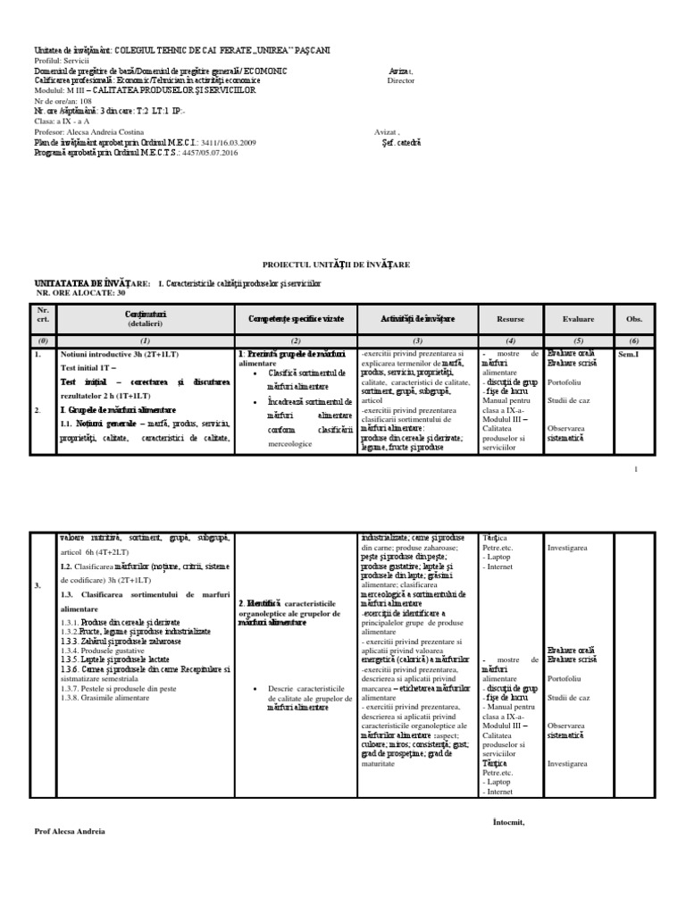 Plan de învăţământ aprobat prin Ordinul M.E.C.I.: 3411/16.03.2009 Şef. catedră