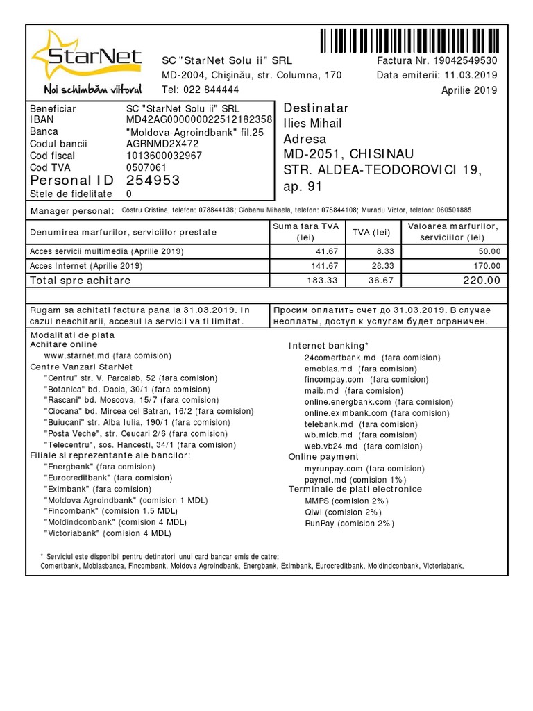 Rugam sa achitati factura pana la 31.03.2019. In Просим оплатить счет до 31.03.2019. В случае
