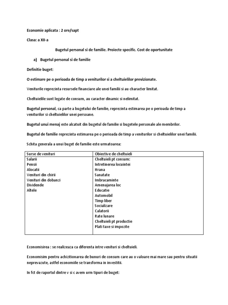 Bugetul personal si de familie. Proiecte specific. Cost de oportunitate