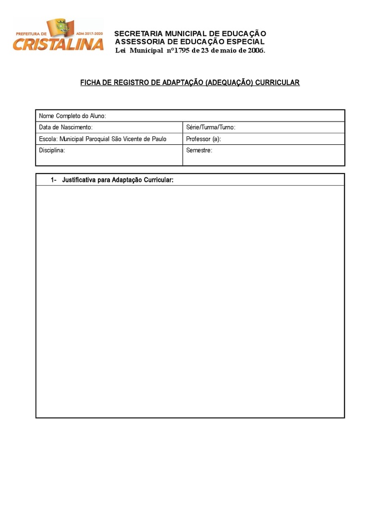 FICHA DE REGISTRO DE ADAPTAÇÃO (ADEQUAÇÃO) CURRICULAR