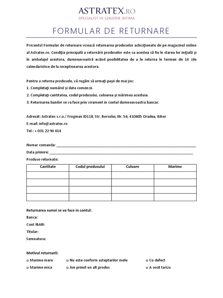 Prezentul Formular de returnare vizează returnarea produselor achiziţionate de pe magazinul online