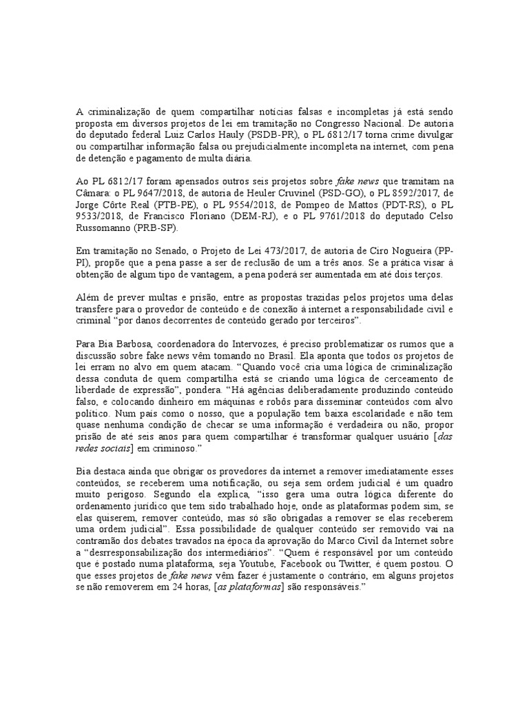 discussão sobre fake news vêm tomando no Brasil. Ela aponta que todos os projetos de