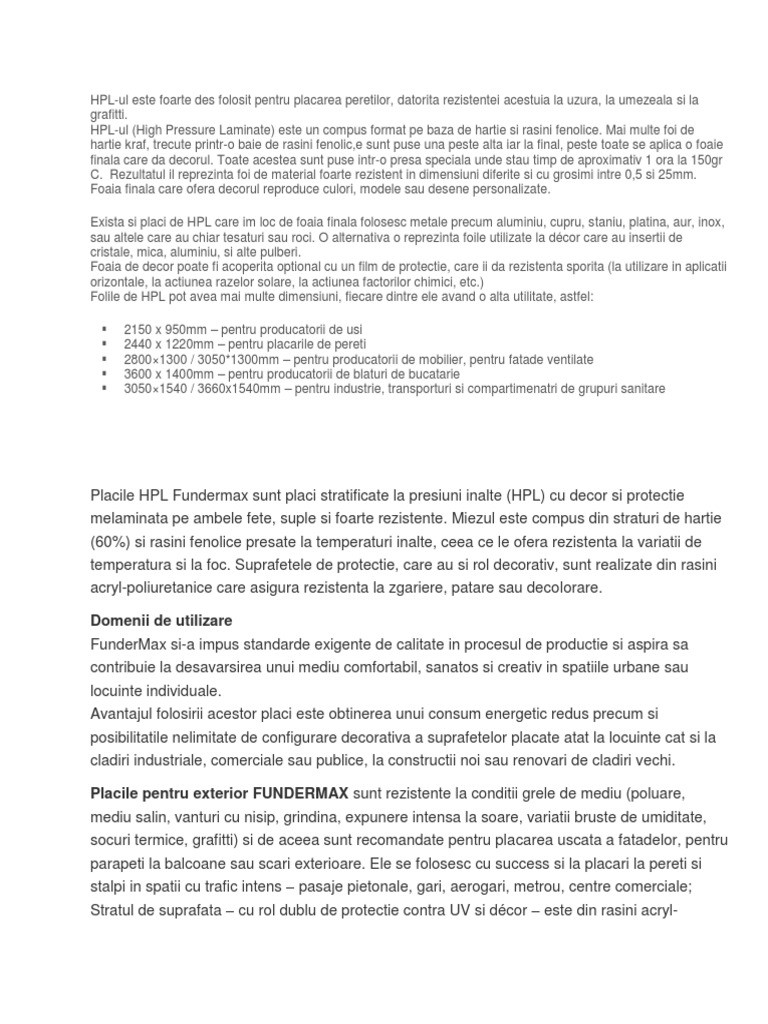 HPL-ul (High Pressure Laminate) este un compus format pe baza de hartie si rasini fenolice. Mai multe foi de