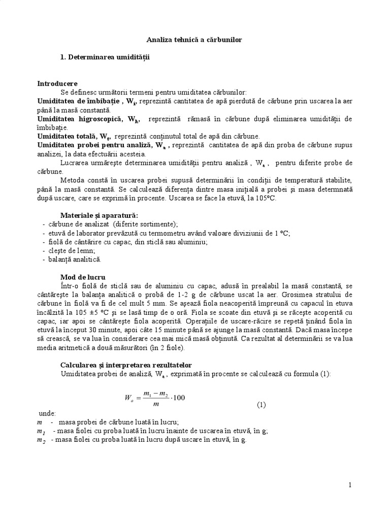 Umiditatea de îmbibaţie , Wi, reprezintă cantitatea de apă pierdută de cărbune prin uscarea la aer