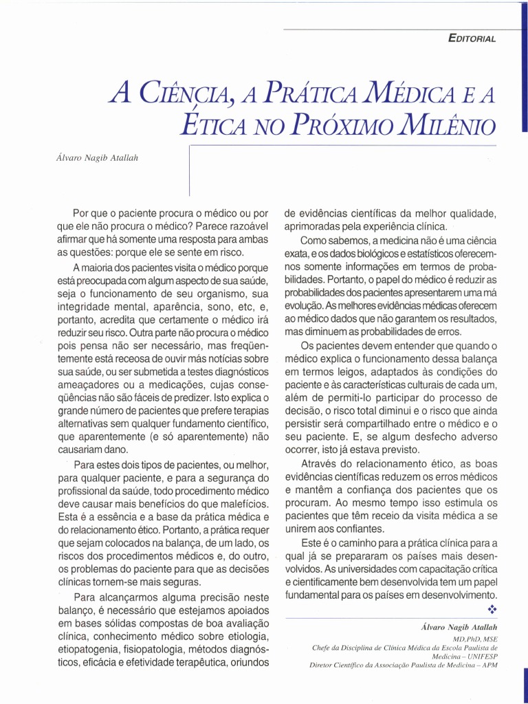 de evidências científicas da melhor qualidade, aprimoradas pela experiência clínica. Como sabemos, a medicina não é uma ciência exata, e os dados biológicos e estatísticos oferecem- nos somente informações em termos de proba- bilidades. Portanto, o papel do médico é reduzir as probabilidades dos pacientes apresentarem uma má evolução. As melhores evidências médicas oferecem ao médico dados que não garantem os resultados, mas diminuem as probabilidades de erros. Os pacientes devem entender que quando o médico explica o funcionamento dessa balança em termos leigos, adaptados às condições do paciente e às características culturais de cada um, além de perrniti-lo participar do processo de decisão, o risco total diminui e o risco que ainda persistir será compartilhado entre o médico e o seu paciente. E, se algum desfecho adverso ocorrer, isto já estava previsto. Através do relacionamento ético, as boas evidências científicas reduzem os erros médicos e mantêm a confiança dos pacientes que os procuram. Ao mesmo tempo isso estimula os pacientes que têm receio da visita médica a se unirem aos confiantes. Este é o caminho para a prática clínica para a qual já se prepararam os países mais desen- volvidos. As universidades com capacitação crítica e cientificamente bem desenvolvida tem um papel fundamental para os países em desenvolvimento.
