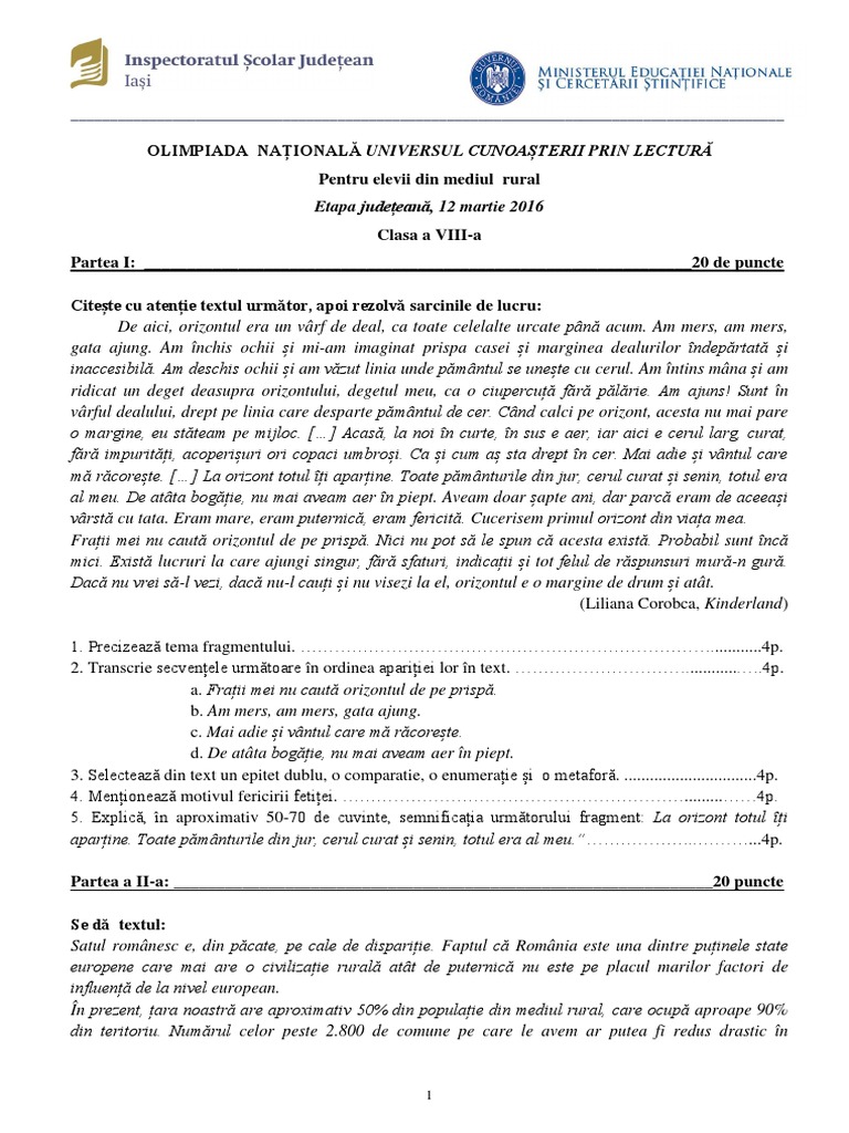 1. Transcrie următorul fragment pe foaia de examen, completându-l cu informațiile corespunzătoare: În